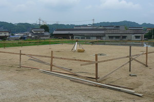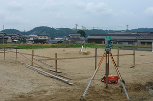 まずは建物外周部に杭を打ち、丁張板という基準にする板を打ちつけていきます