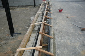 水路にグレーチングを設置するための型枠とアングルを設置しコンクリートを流し込みます。 その後駐車場内の砕石で整え、エンジンプレートという機械で締め固める作業をしていきます