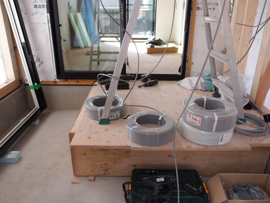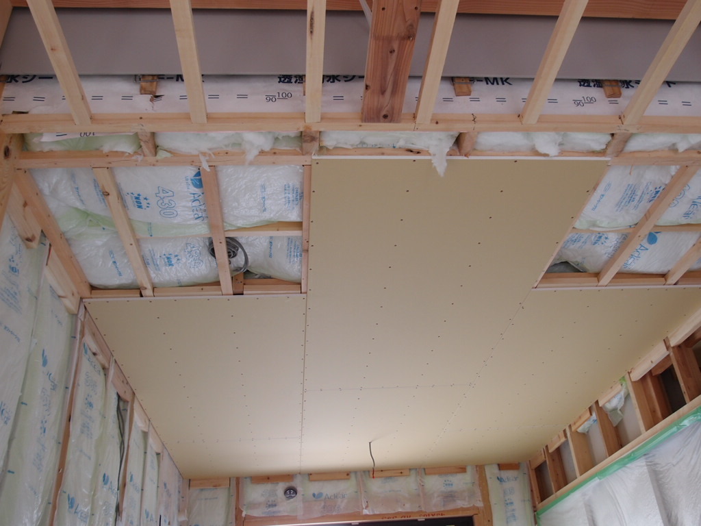 断熱材を敷き詰め、構造用合板を張っている様子です。