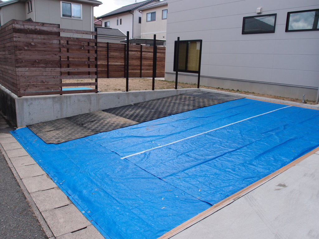 材木で作った目隠しフェンスを一部取り外し、駐車場を養生しました。