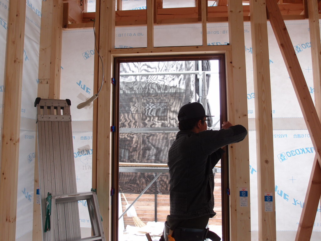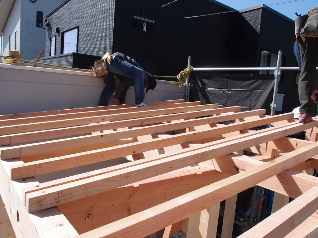 断熱材を敷き詰め、構造用合板を張っている様子です。