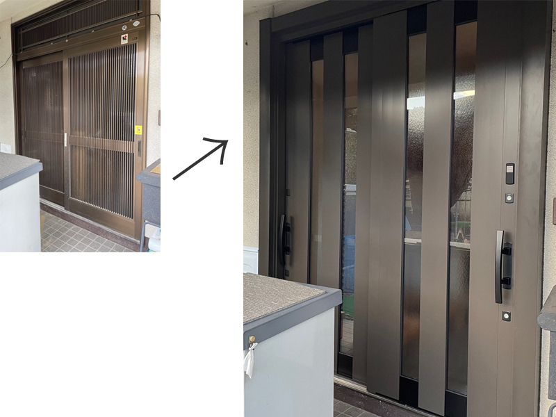 もう1件の福山市のお客様は、LIXILのリシェント玄関引戸(P17型・オータムブラウン)に交換しました。