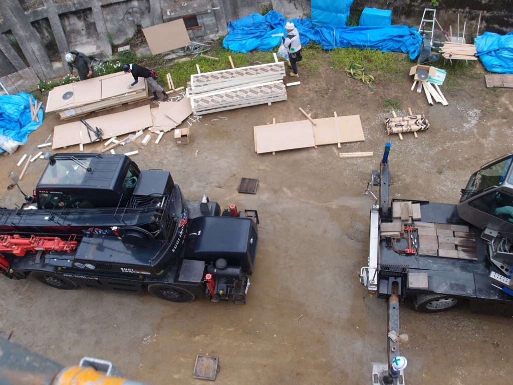 母屋の二階建てと離れの平屋の2棟を同時に建築しており、6月下旬の上棟の日にはクレーン2台を配置し、たくさんの大工さんにご協力いただきました。
