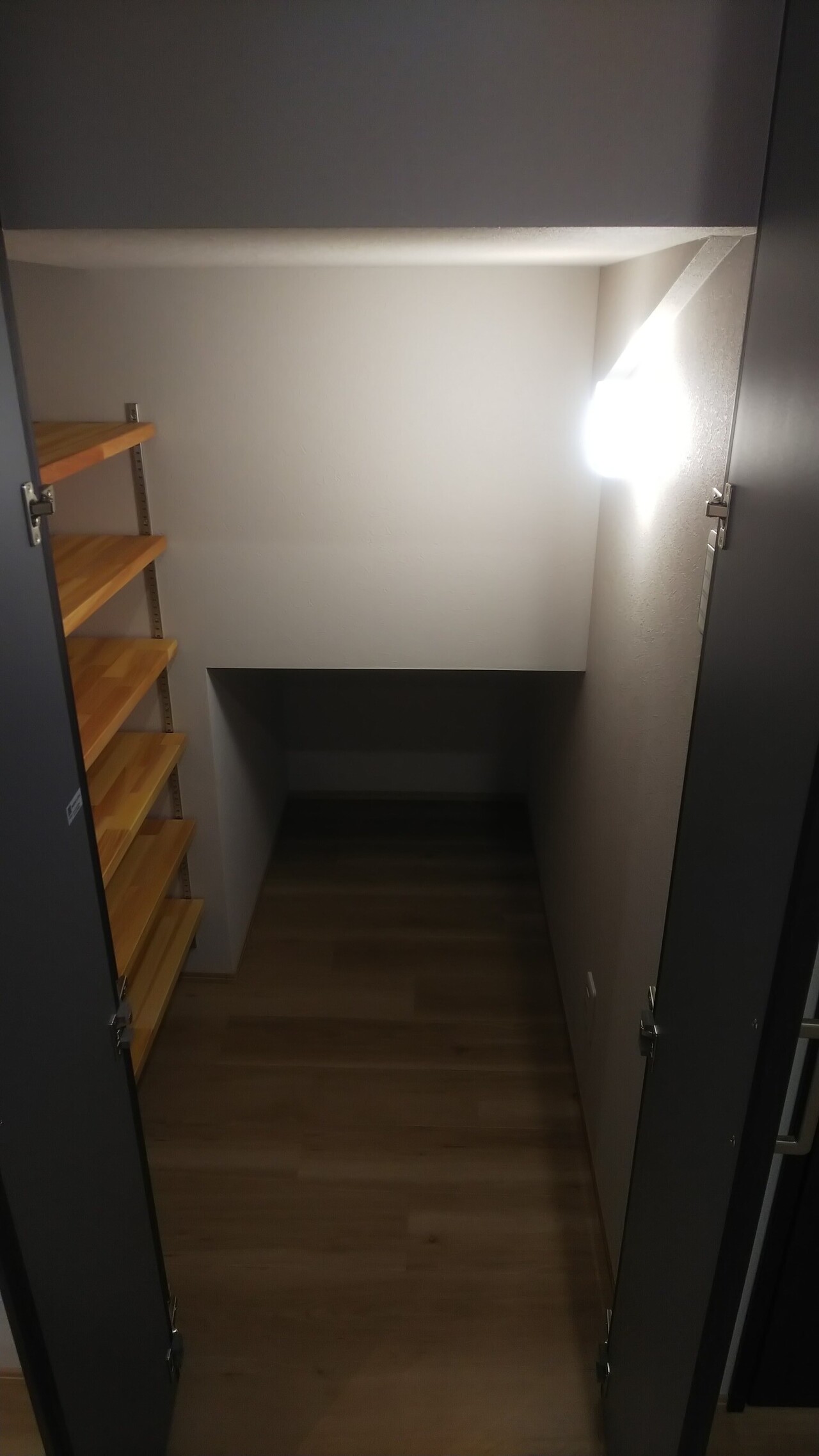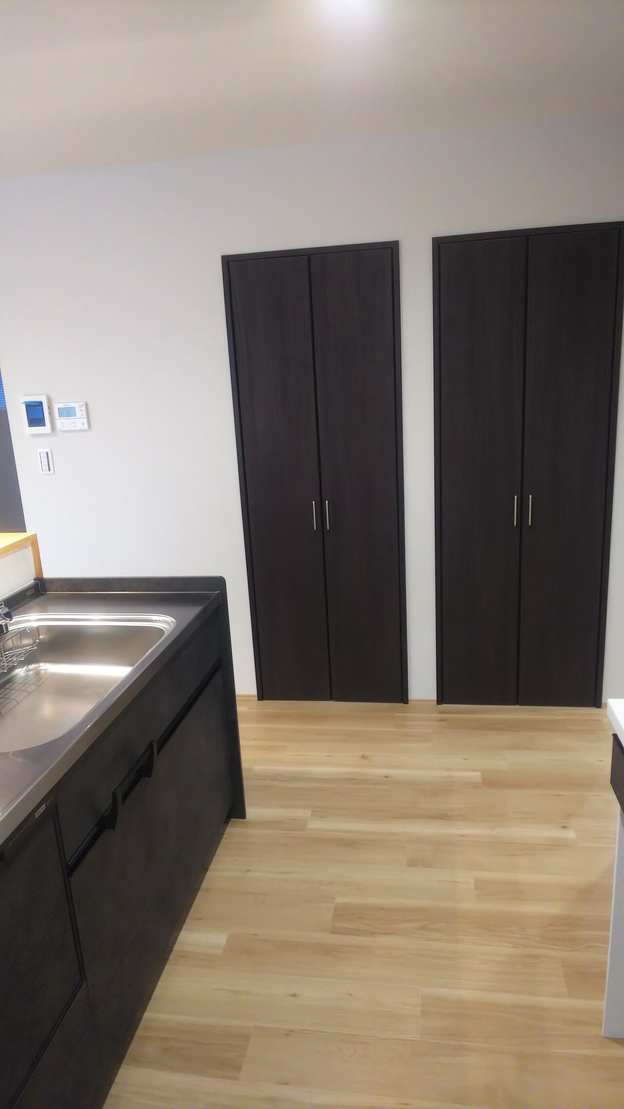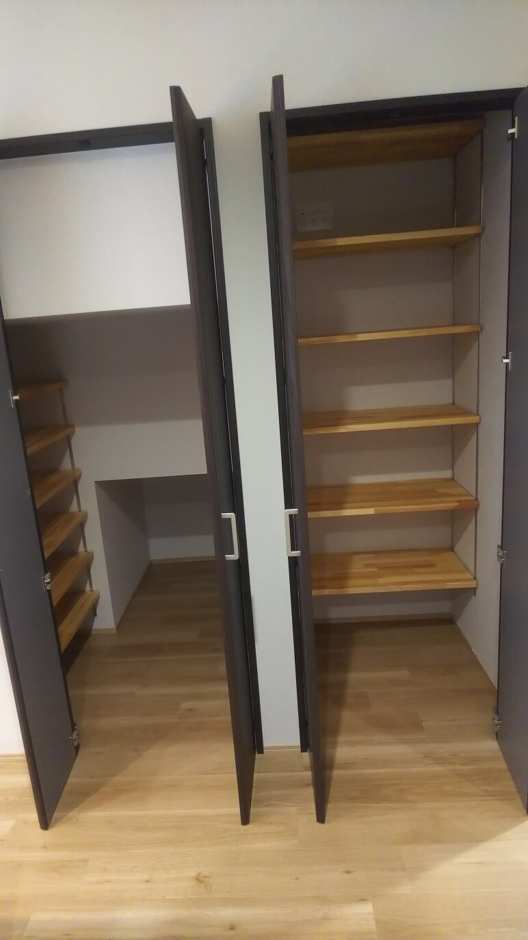 キッチン横の壁に2つ並ぶ扉の中の収納の使い勝手は抜群です。