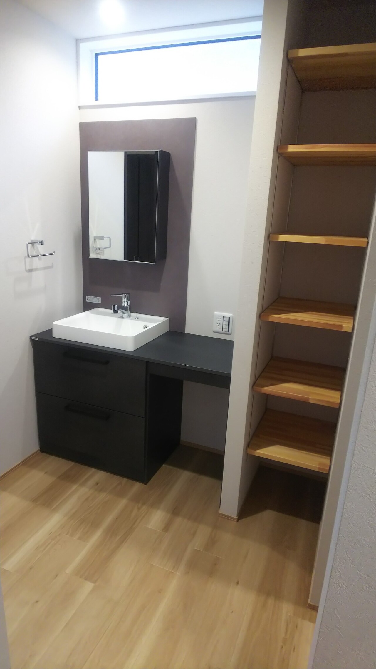 洗面台横には、タオルなどを置いておける棚を設けました。