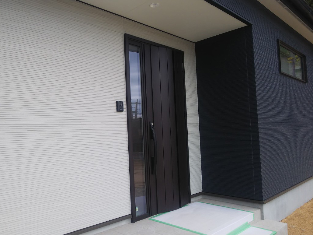 奥様のこだわりのサイディングは、ダーク色をメインに部分的に明るい色で張分けしました。