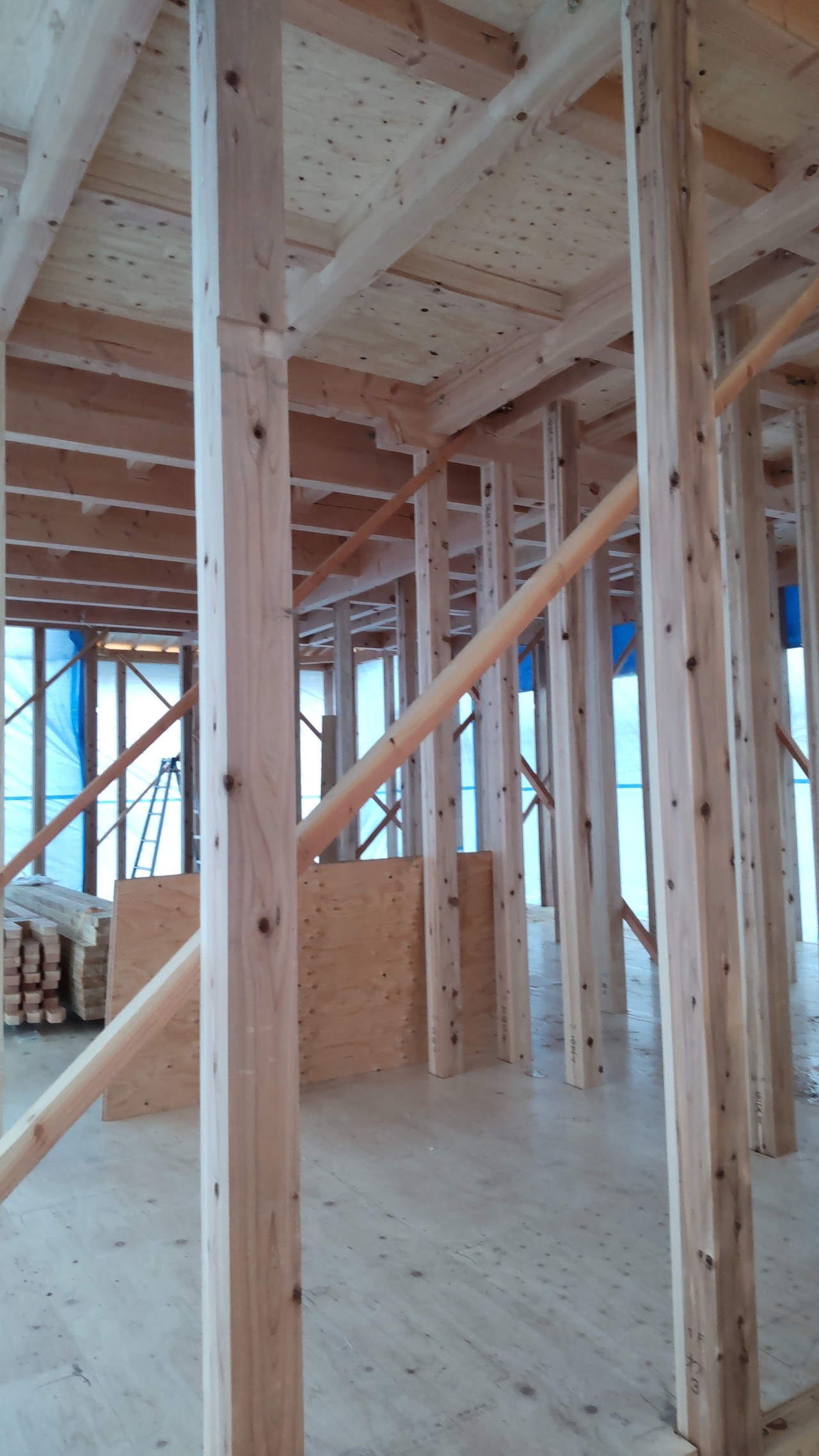 同じサイズの個室が並ぶので、一般の住宅の骨組みと比べると規則的に見えますかね。
