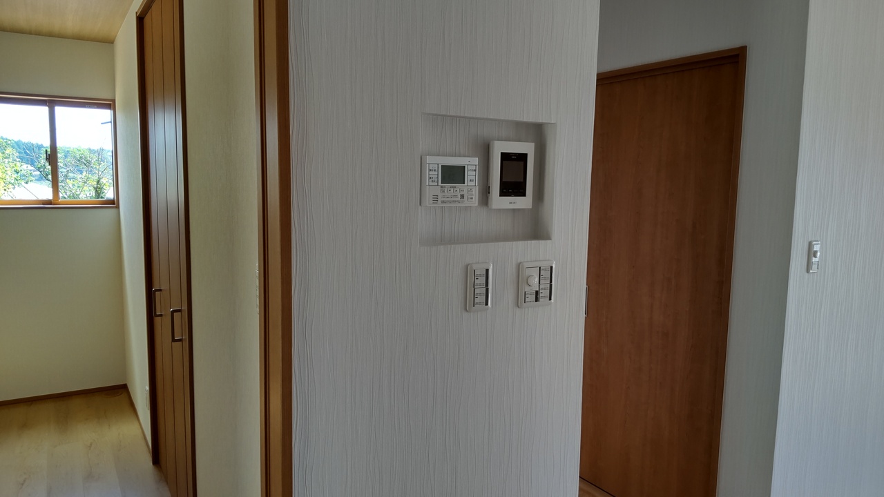 毎日使うリモコンやスイッチ類は、壁のニッチにすっきりと収めました。