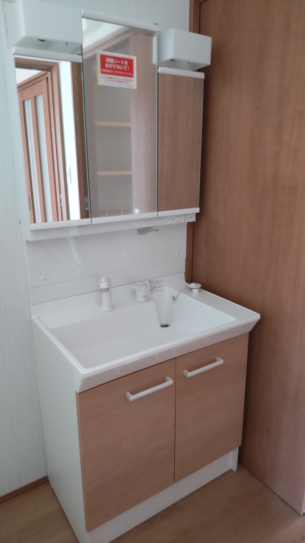 明るく清潔感のある洗面所は、三面鏡の裏にたっぷりと収納スペースがあるタイプを選びました。