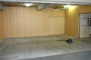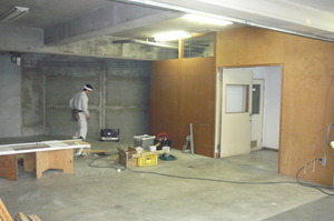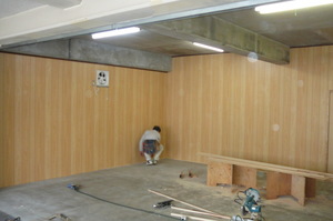 このコンクリートむき出しの部分に仕切壁などを作って仕上げる工事です。今回のお施主様は法人様で、これから現在ある自社ビルを解体されて新しいビルを建てられます  完成は1年半年後です。今回のこの工事はその期間を過ごす仮事務所の工事です。コンクリートに木造下地を作り、いざ仕上げの合板張です