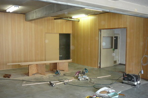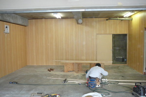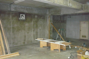 このコンクリートむき出しの部分に仕切壁などを作って仕上げる工事です。今回のお施主様は法人様で、これから現在ある自社ビルを解体されて新しいビルを建てられます  完成は1年半年後です。今回のこの工事はその期間を過ごす仮事務所の工事です。コンクリートに木造下地を作り、いざ仕上げの合板張です