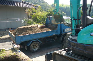 埋め戻し砂を使いしっかり水締めしながら埋め戻していきます