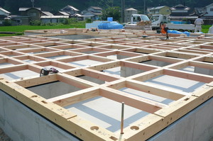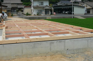 通気のための基礎パッキンを基礎全周に取付、その上に土台の木材を取付けていきます![]()