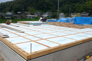 その後床の断熱材を敷き詰めていき、その上に床合板を張っていきます