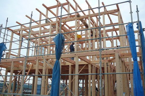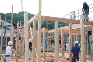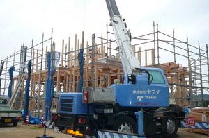 前日までには先行足場の工事を終え、軸組仕事をして雨養生を終えていざ棟上へ![]()