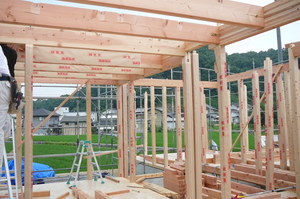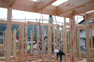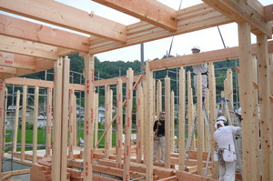 前日までには先行足場の工事を終え、軸組仕事をして雨養生を終えていざ棟上へ![]()