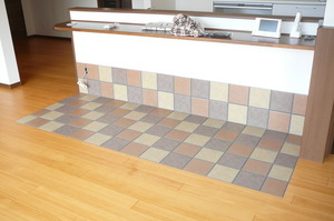 キッチン対面側にカウンターを設置し、足元に内装タイルを張りました