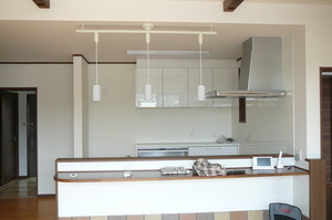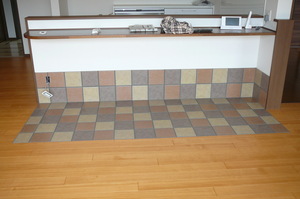 キッチン対面側にカウンターを設置し、足元に内装タイルを張りました
