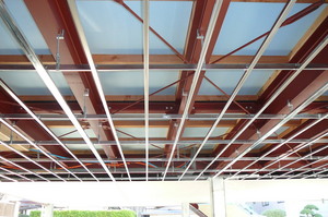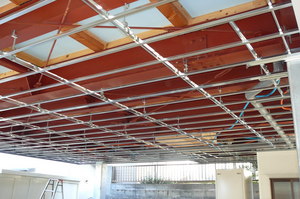 その上から不燃の天井仕上材料を張っていきます  これで剥き出しになってた鉄骨も隠れて、すっきりとしましたね~