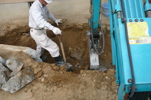 まずは重機を搬入し杭打工事の支障となる地中障害物を撤去します![]()