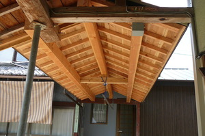 引続いて、母屋と離れをつなぐ外部の渡り廊下の屋根工事を行いました![]()