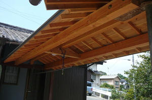 引続いて、母屋と離れをつなぐ外部の渡り廊下の屋根工事を行いました![]()