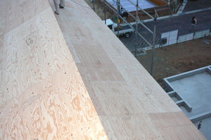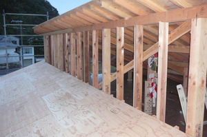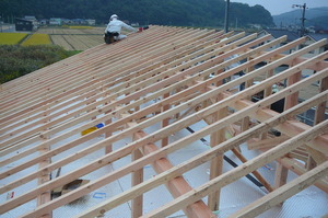 小屋の天井断熱を敷き詰めて屋根垂木を設置し、屋根合板を張っていきます![]()
