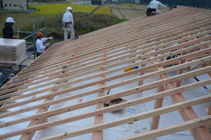 小屋の天井断熱を敷き詰めて屋根垂木を設置し、屋根合板を張っていきます![]()