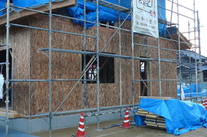 この日は1階部分のスーパーウォール壁パネルを取り付け完了です