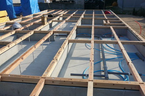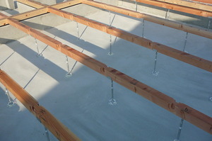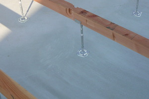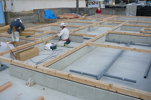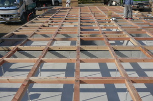 土台の取付作業の後は大引と言う部材を取付て鋼製束にて基礎土間に固定し水平を確認します![]()