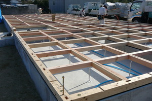 土台の取付作業の後は大引と言う部材を取付て鋼製束にて基礎土間に固定し水平を確認します![]()