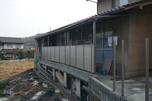 化粧ブロックをついてフェンスの柱を埋め込みます       母屋側にはテラスを取り付けます