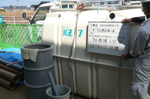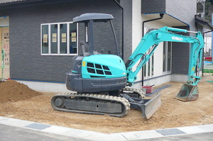 まずはいつものように相棒のショベルカーを搬入です と思いきや、浄化槽の埋設場所に仮設の電柱があり、大きな機械が入らず急遽会社へ帰り、小さな相棒のショベルカーを持って来る事に
