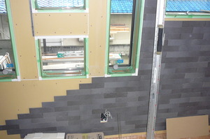半分黒、半分白で今回は張り分けていきます 今回使用してエコカラットはLIXILタイル建材 グラナス ハルトパールマスクと言う商品です 日本の気候と相性のいい土壁をルーツにもつ多孔質セラミックスが、家の中の空気を吸って吐いて、季節をとわず快適な湿度を保ち、気になる臭いや有害な物質を低減していきます。まさに調質建材の極みですね~
