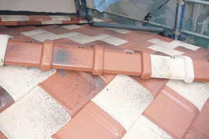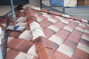 まずは古い瓦を撤去します 大屋根と同じですね    そして下地処理後、新しい瓦を葺いていきます