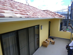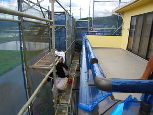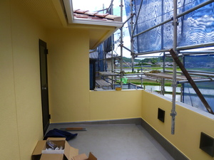 外壁の塗装工事も無事終わりこの日は新しいテラス屋根とバルコニーの手すり工事に取り掛かりました![]()