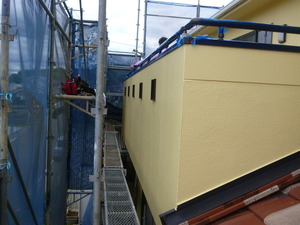 外壁の塗装工事も無事終わりこの日は新しいテラス屋根とバルコニーの手すり工事に取り掛かりました![]()
