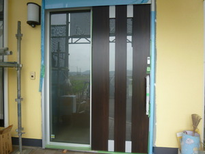 玄関サッシの入れ替え工事時に発生したサッシ廻りの補修はあえて塗装はせずタイル張でアクセントです
