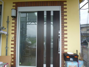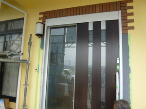 玄関サッシの入れ替え工事時に発生したサッシ廻りの補修はあえて塗装はせずタイル張でアクセントです