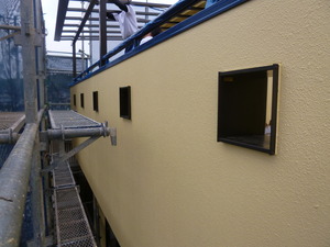 遠目でわかりにくいですが、写真右上のバルコニーエアイン小窓の下端に少しデザインの違うタイルを張ってみました