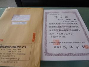今日、6月24日はこの前受講した産業廃棄物収集・運搬業の更新講習のテストの合否が東京から届く日です