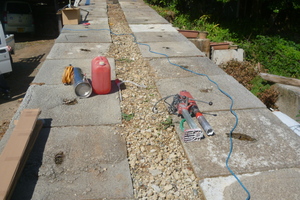今回の工事はスロープ両端に外部アルミ手すりを取付、既存のスロープの道幅を拡幅し、最後にコンクリート舗装をして仕上げるという工事内容です まずは拡幅しない片方の外部手すり工事です 既存のコンクリートブロックにダイヤモンドコアという特殊な機械で穴をあけていきます