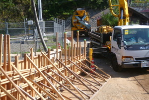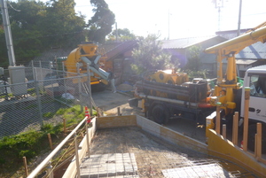 今回はコンクリートポンプ車の登場です これの力を借りて一気にコンクリートを打設していきます
