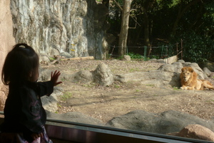 近くで見る動物に大喜びの娘