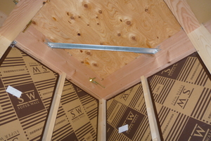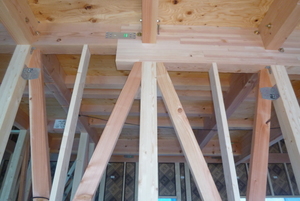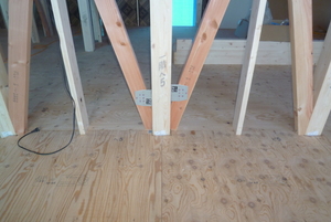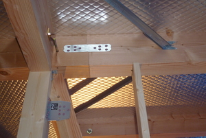 躯体の耐震性能、気密性能、断熱性能を高めるSWパネルの取付も終わり、今度は内部の筋交、柱頭柱脚金物等の取付作業![]()