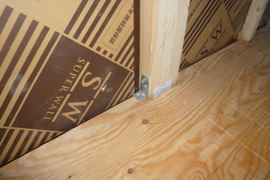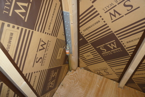 躯体の耐震性能、気密性能、断熱性能を高めるSWパネルの取付も終わり、今度は内部の筋交、柱頭柱脚金物等の取付作業![]()