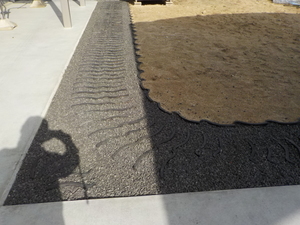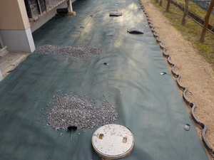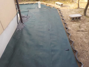 びんごテコラを敷き詰める前に、雑草対策をより効果絶大にするために、特殊な防草シートを貼ります![]()