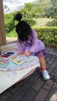 書くことが好きな娘は、屋外にまでノートやクレヨンをリュックに入れて出かけます![]()