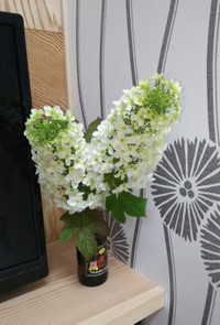 我が家には花器があまりないので、娘の写真入りビールの空瓶やドレッシング、ジュースの瓶も活用しましたぁ