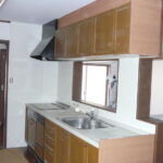 • これまた再利用のキッチン背面収納です。現場で加工を駆使して取付ました。左側は冷蔵庫収納です。